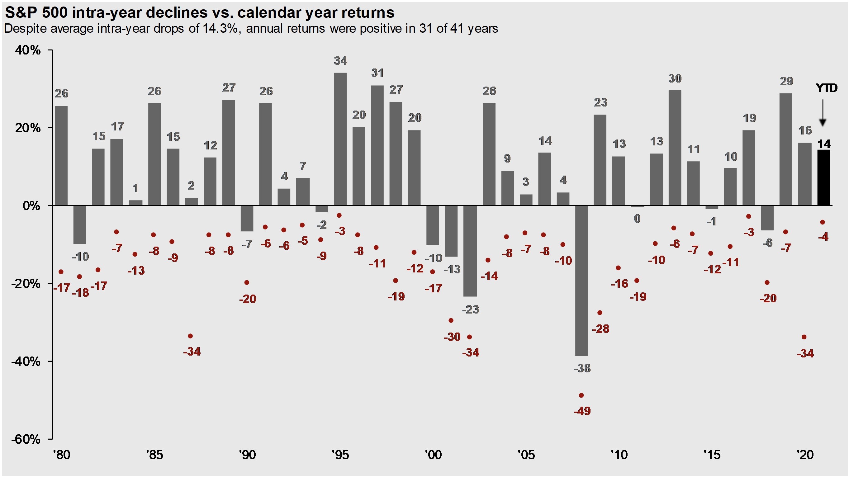 Investors would be wise to “be a goldfish” during the inevitable times when the equity markets abruptly and unexpectedly go down. And since we’re experiencing an unprecedented famine in market declines, now might be the time to reflect on the market’s normal volatility. As the chart below illustrates (source: JP Morgan), the average intra-year decline is about 14%. Investors shouldn’t be surprised or alarmed if we experience such a decline (or worse) in the coming months. That’s not a prediction, just a reminder of what the averages are when it comes to investing. So, when such a time comes, be a goldfish.