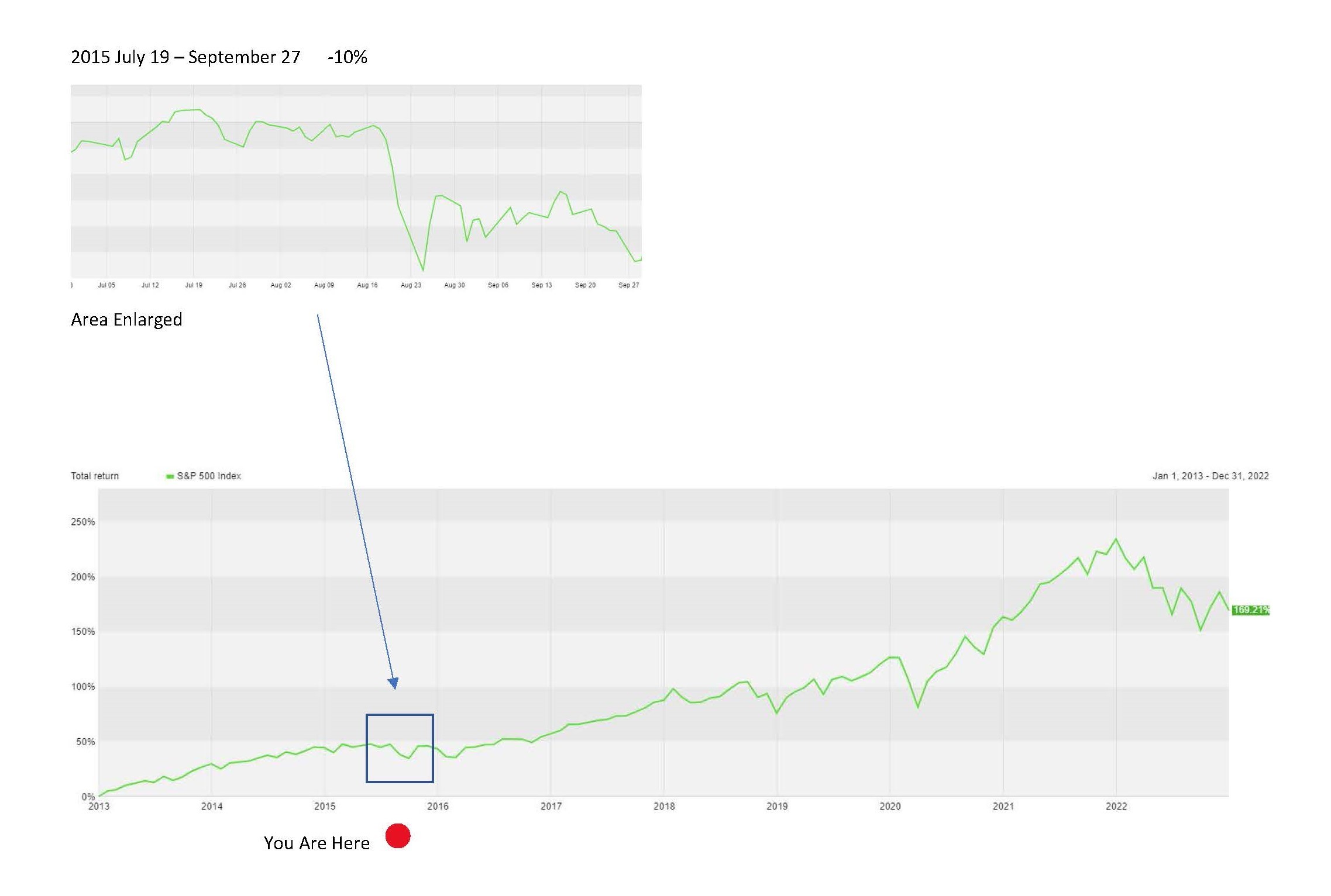 I noted that the same technique is helpful in putting one’s investment experience into context. I pulled out the chart above and asked the gentleman to consider how last year’s temporary declines in the market might parallel the “You Are Here” blip noted in 2015.